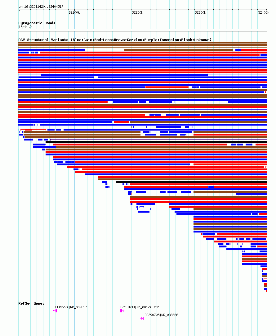 Variant DetailsVariant: essv25790507| Internal ID | 19177018 | | Landmark | | | Location Information | | | Cytoband | 16p11.2 | | Allele length | | Assembly | Allele length | | hg38 | 393098 | | hg19 | 393098 | | hg18 | 393098 |