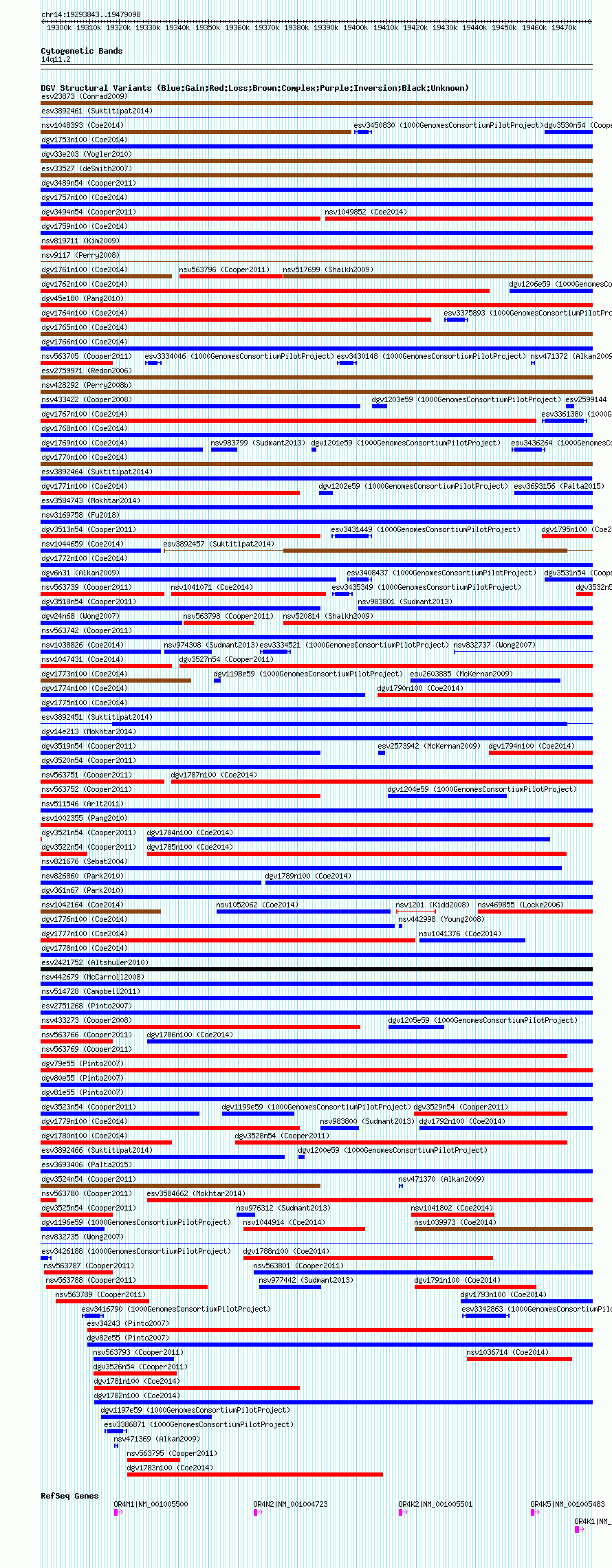 Variant DetailsVariant: essv25790569| Internal ID | 19178617 | | Landmark | | | Location Information | | | Cytoband | 14q11.2 | | Allele length | | Assembly | Allele length | | hg38 | 185256 | | hg19 | 185256 | | hg18 | 185256 |