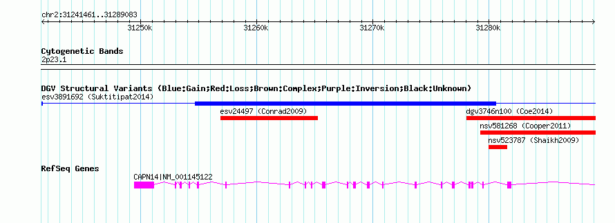 | | Variant Type | CNV gain | | Copy Number | 3 | | Allele State | | | Allele Origin | | | Probe Count | | | Validation Flag | | | Merged Status | S | | Merged Variants | esv3891692 | | Supporting Variants | | | Samples | | | Known Genes | CAPN14 | | Method | SNP array | | Analysis | | | Platform | Illumina HumanHap 610 | | Comments | Number of probes=30 | | Reference | Suktitipat_et_al_2014 | | Pubmed ID | 25118596 | | Accession Number(s) | essv25790591