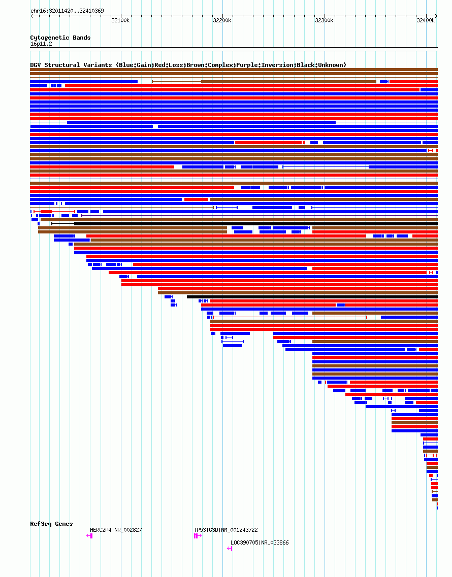 | | Variant Type | CNV gain | | Copy Number | 3 | | Allele State | | | Allele Origin | | | Probe Count | | | Validation Flag | | | Merged Status | S | | Merged Variants | esv3892833 | | Supporting Variants | | | Samples | | | Known Genes | HERC2P4, LOC390705, TP53TG3D | | Method | SNP array | | Analysis | | | Platform | Illumina HumanHap 610 | | Comments | Number of probes=163 | | Reference | Suktitipat_et_al_2014 | | Pubmed ID | 25118596 | | Accession Number(s) | essv25790913
