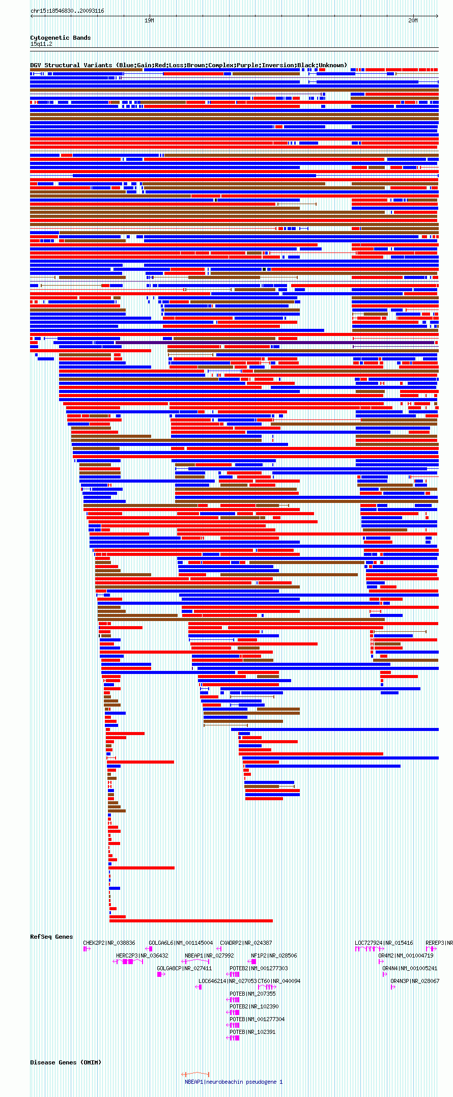 Variant DetailsVariant: essv25791098| Internal ID | 19163460 | | Landmark | | | Location Information | | | Cytoband | 15q11.1 | | Allele length | | Assembly | Allele length | | hg38 | 2222239 | | hg19 | 2304937 | | hg18 | 1546287 |