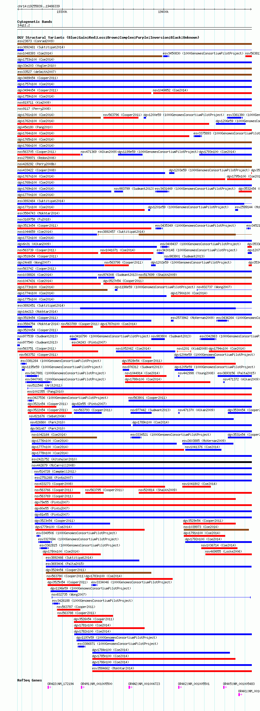 Variant DetailsVariant: essv25791127| Internal ID | 19182419 | | Landmark | | | Location Information | | | Cytoband | 14q11.2 | | Allele length | | Assembly | Allele length | | hg38 | 230501 | | hg19 | 230501 | | hg18 | 230501 |