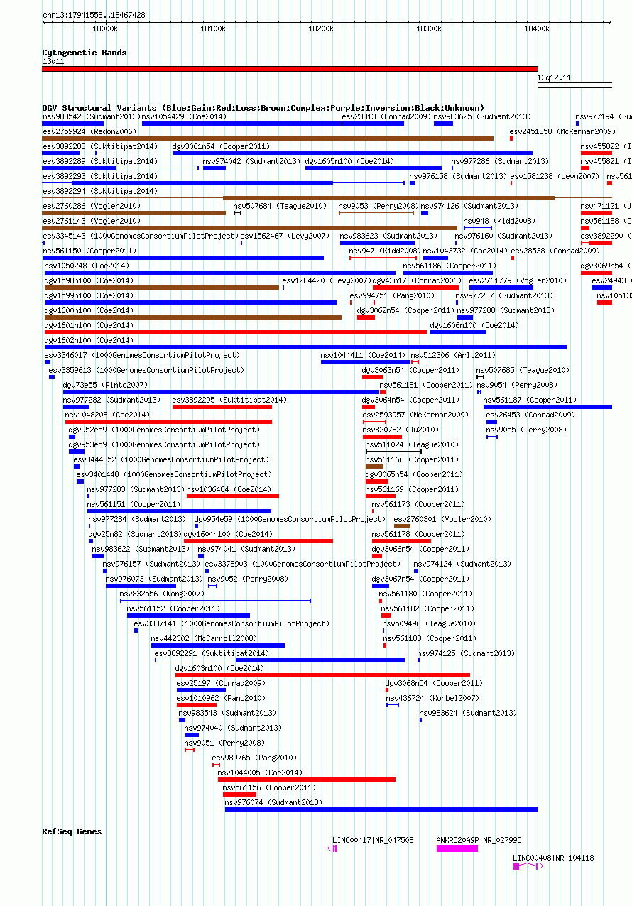 Variant DetailsVariant: essv25791314| Internal ID | 19165414 | | Landmark | | | Location Information | | | Cytoband | 13q11 | | Allele length | | Assembly | Allele length | | hg38 | 525871 | | hg19 | 525871 | | hg18 | 525871 |