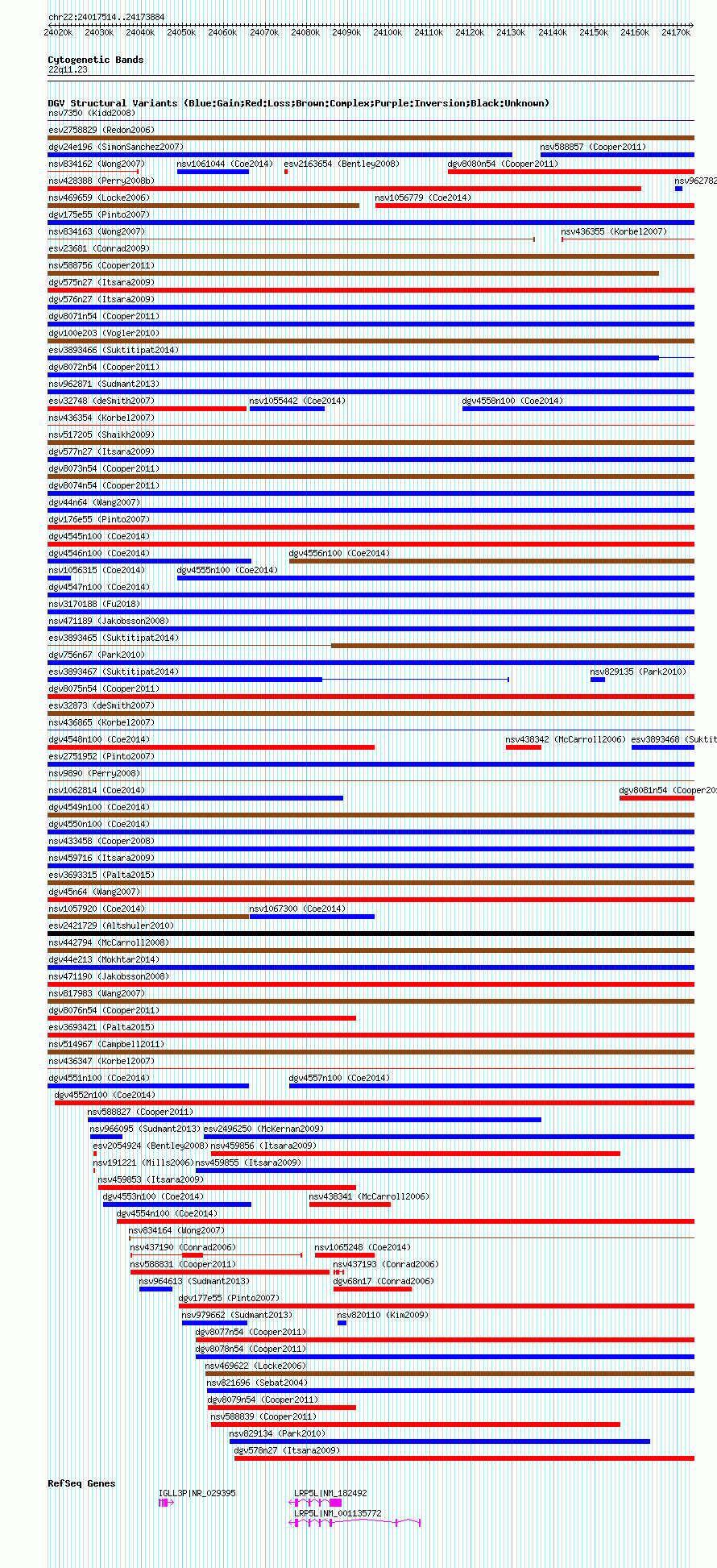 Variant DetailsVariant: essv25791433| Internal ID | 19181448 | | Landmark | | | Location Information | | | Cytoband | 22q11.23 | | Allele length | | Assembly | Allele length | | hg38 | 156371 | | hg19 | 156371 | | hg18 | 156371 |