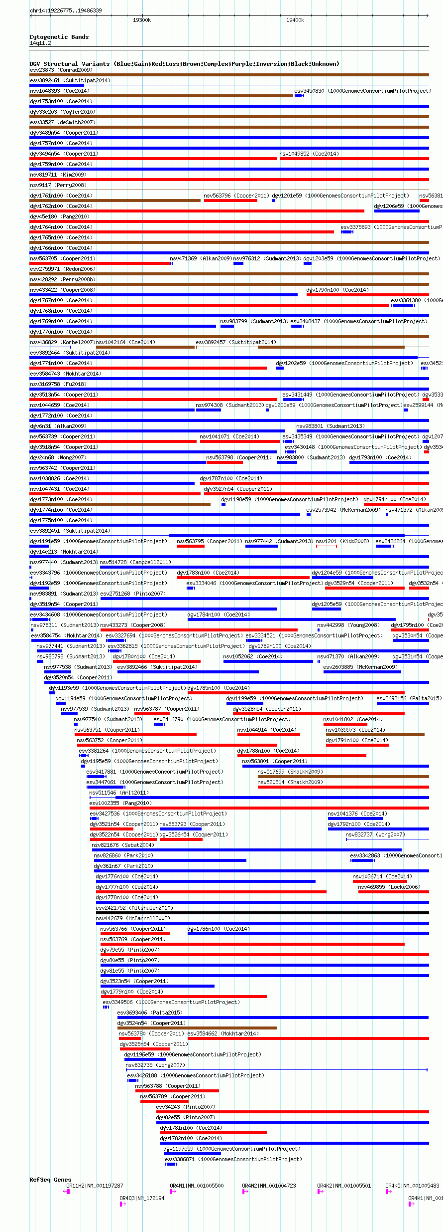 Variant DetailsVariant: essv25791944| Internal ID | 19168698 | | Landmark | | | Location Information | | | Cytoband | 14q11.2 | | Allele length | | Assembly | Allele length | | hg38 | 259565 | | hg19 | 259565 | | hg18 | 259565 |