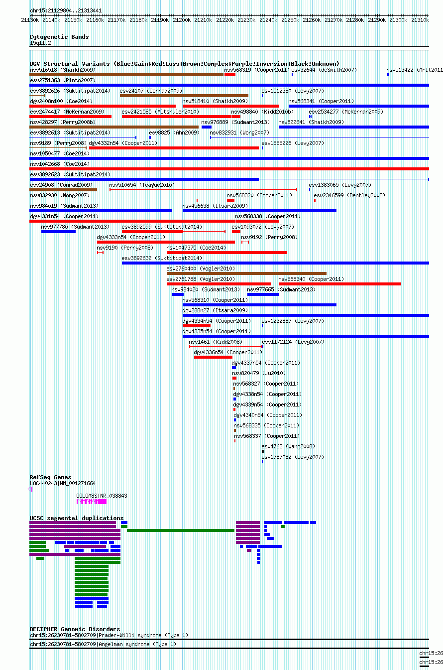 Variant DetailsVariant: essv25791976| Internal ID | 18829415 | | Landmark | | | Location Information | | | Cytoband | 15q11.2 | | Allele length | | Assembly | Allele length | | hg38 | 183986 | | hg19 | 183986 | | hg18 | 183638 |