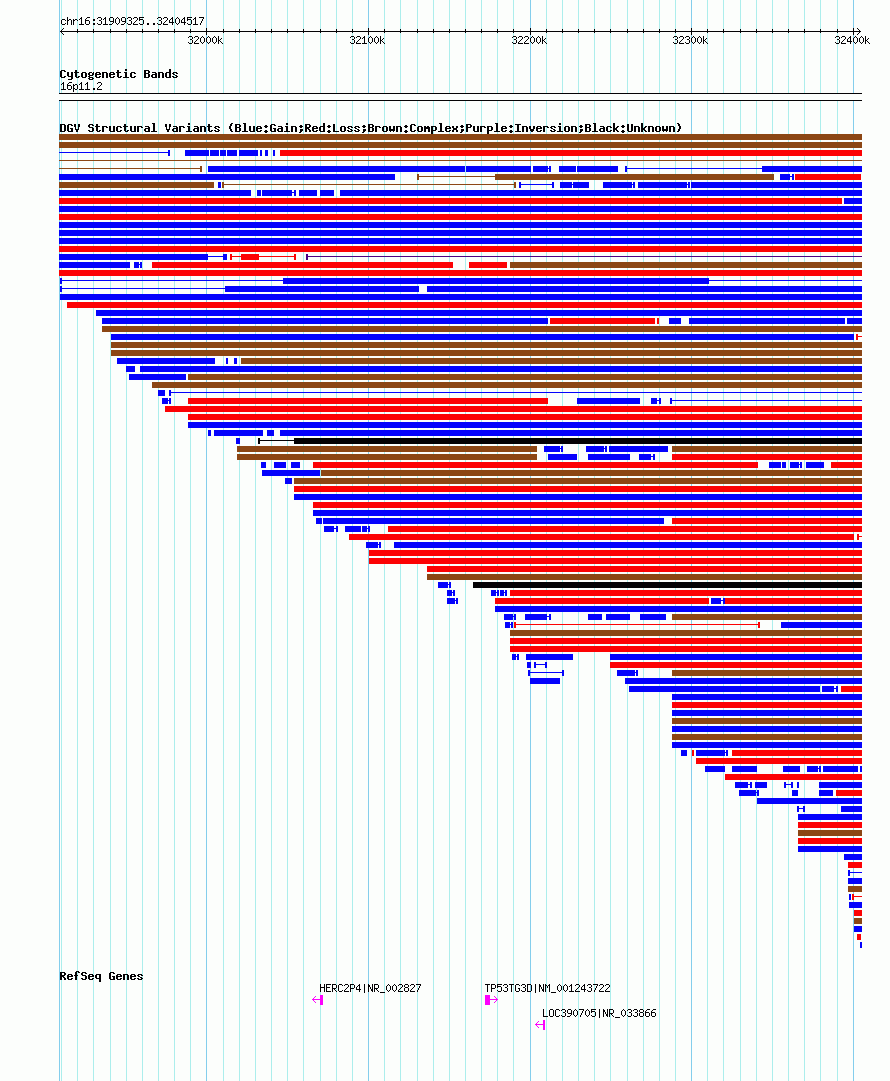 Variant DetailsVariant: essv25792089| Internal ID | 19163432 | | Landmark | | | Location Information | | | Cytoband | 16p11.2 | | Allele length | | Assembly | Allele length | | hg38 | 495193 | | hg19 | 495193 | | hg18 | 495193 |
