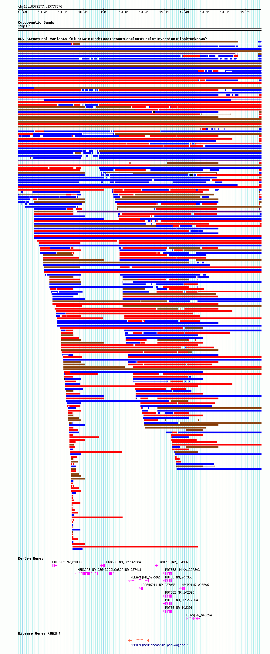Variant DetailsVariant: essv25792436| Internal ID | 19174173 | | Landmark | | | Location Information | | | Cytoband | 15q11.1 | | Allele length | | Assembly | Allele length | | hg38 | 1874552 | | hg19 | 1957250 | | hg18 | 1198600 |