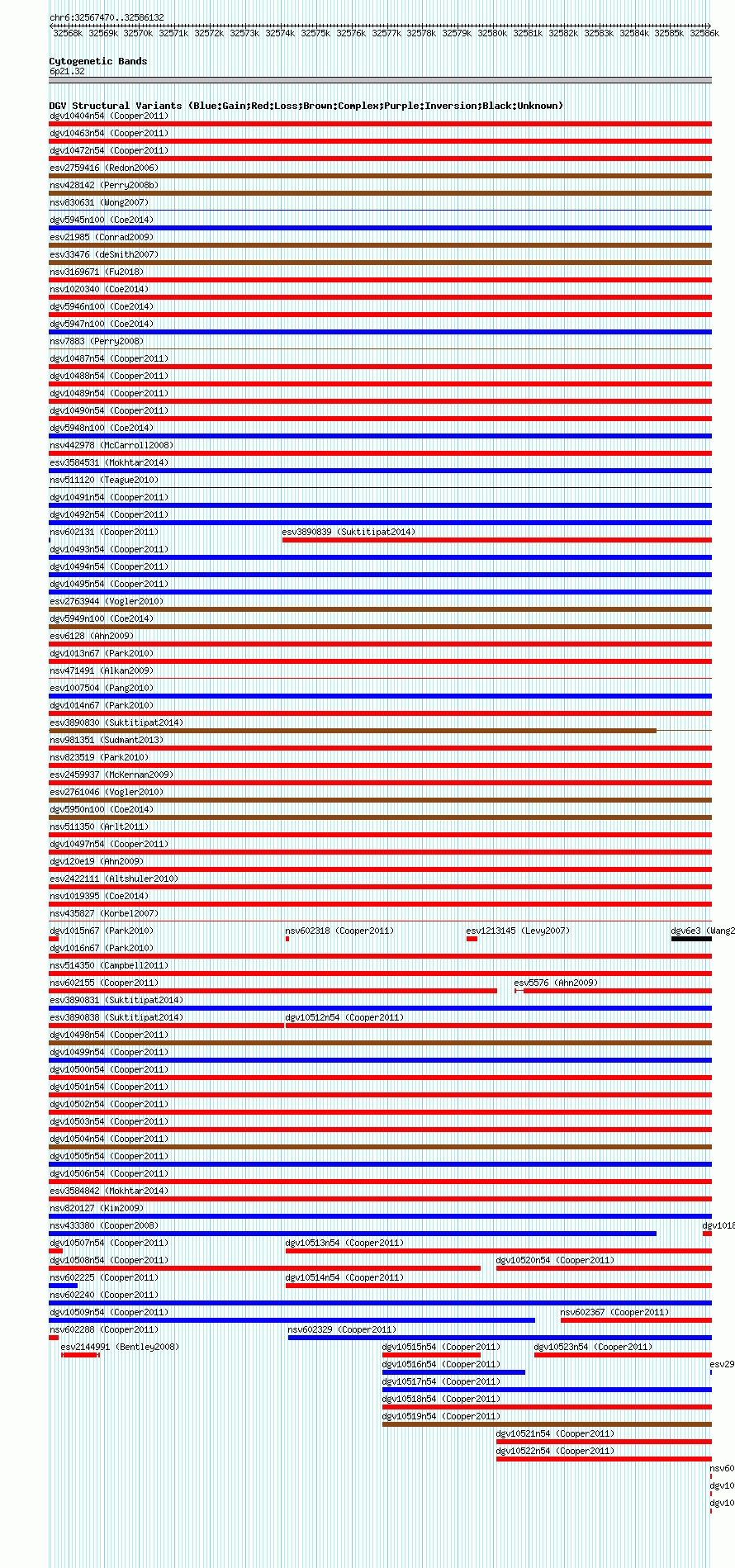Variant DetailsVariant: essv25795970| Internal ID | 19181181 | | Landmark | | | Location Information | | | Cytoband | 6p21.32 | | Allele length | | Assembly | Allele length | | hg38 | 18663 | | hg19 | 18663 | | hg18 | 18663 |