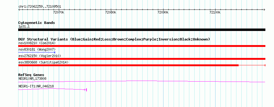 Variant DetailsVariant: essv25796050| Internal ID | 18815946 | | Landmark | | | Location Information | | | Cytoband | 1p31.1 | | Allele length | | Assembly | Allele length | | hg38 | 47243 | | hg19 | 47243 | | hg18 | 47243 |