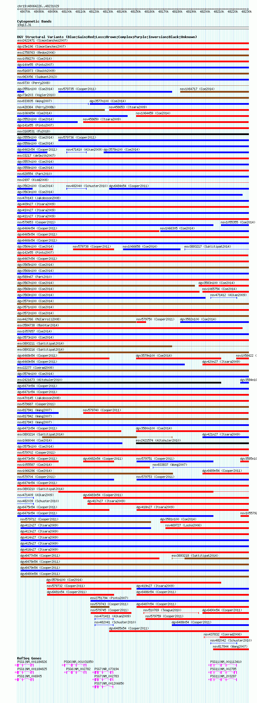 Variant DetailsVariant: essv25798035| Internal ID | 19159792 | | Landmark | | | Location Information | | | Cytoband | 19q13.2 | | Allele length | | Assembly | Allele length | | hg38 | 166804 | | hg19 | 166804 | | hg18 | 166804 |