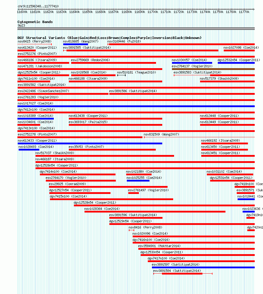Variant DetailsVariant: essv25798790| Internal ID | 19160842 | | Landmark | | | Location Information | | | Cytoband | 9p23 | | Allele length | | Assembly | Allele length | | hg38 | 181063 | | hg19 | 181063 | | hg18 | 181063 |