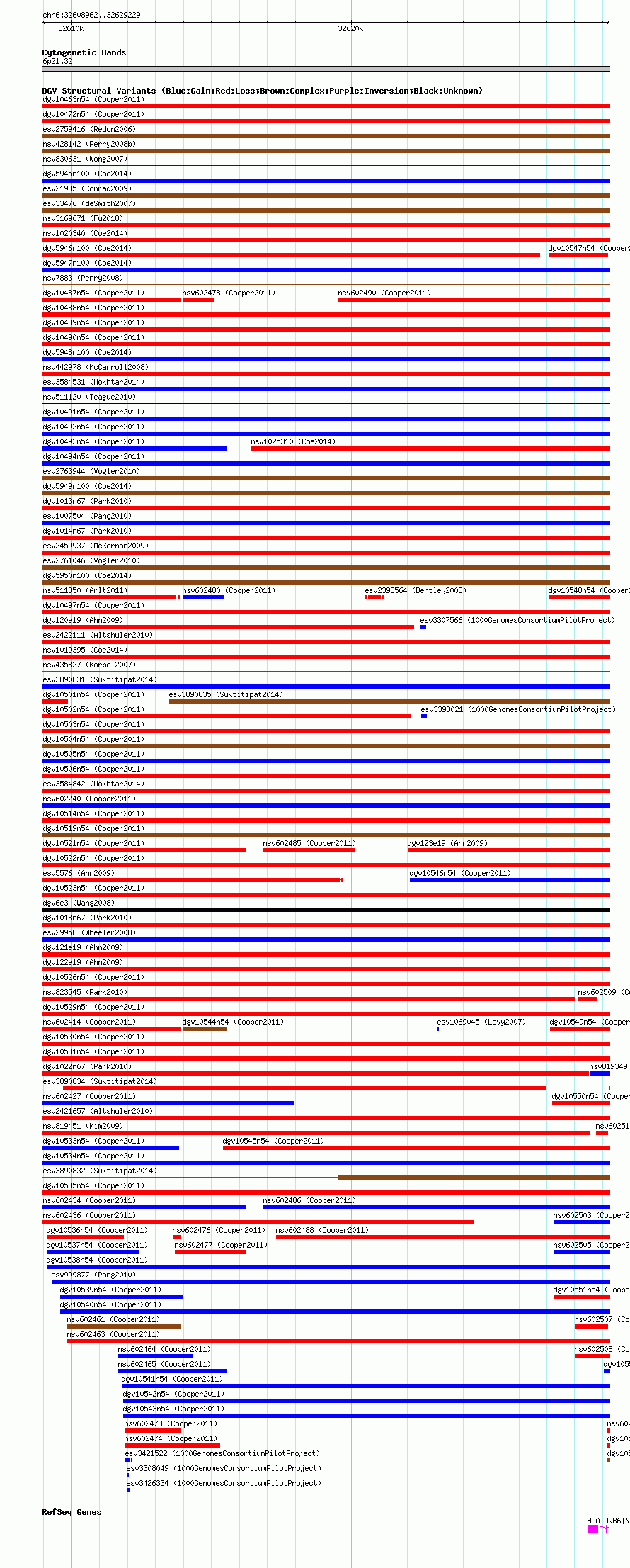Variant DetailsVariant: essv25798995| Internal ID | 19171768 | | Landmark | | | Location Information | | | Cytoband | 6p21.32 | | Allele length | | Assembly | Allele length | | hg38 | 20268 | | hg19 | 20268 | | hg18 | 20268 |