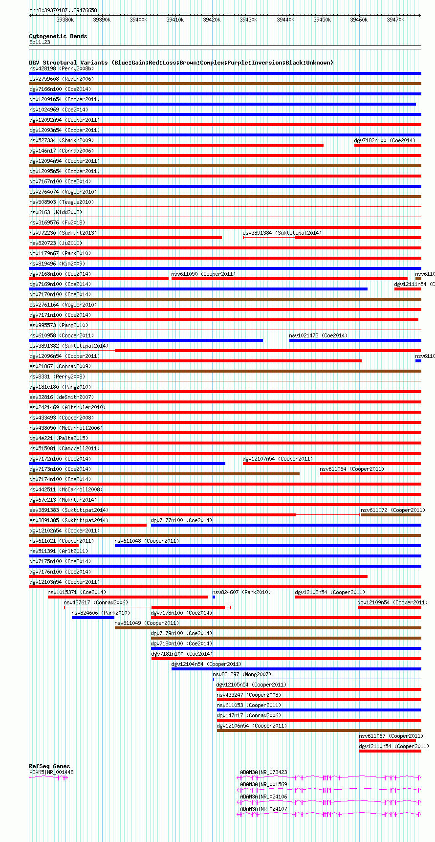 Variant DetailsVariant: essv25801415| Internal ID | 19170813 | | Landmark | | | Location Information | | | Cytoband | 8p11.22 | | Allele length | | Assembly | Allele length | | hg38 | 106472 | | hg19 | 106472 | | hg18 | 106472 |