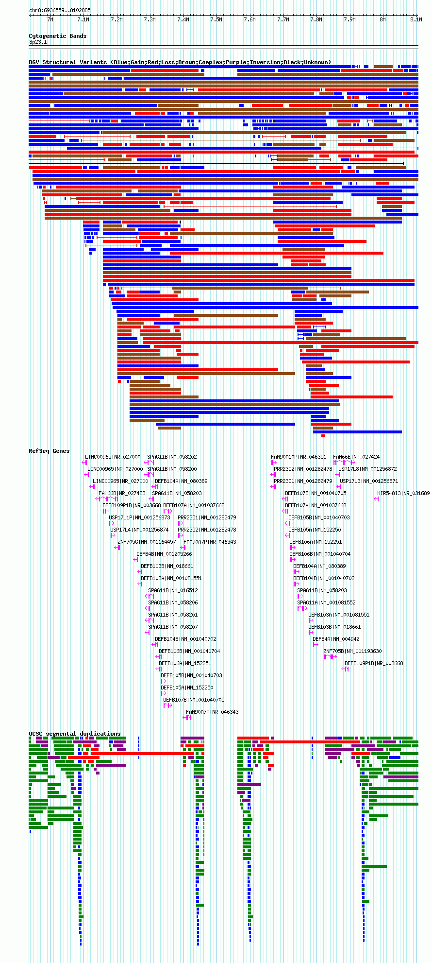 | | Variant Type | CNV loss | | Copy Number | | | Allele State | | | Allele Origin | | | Probe Count | | | Validation Flag | | | Merged Status | S | | Merged Variants | esv2758147 | | Supporting Variants | | | Samples | NA18529 | | Known Genes | DEFB103A, DEFB103B, DEFB104A, DEFB104B, DEFB105A, DEFB105B, DEFB106A, DEFB106B, DEFB107A, DEFB107B, DEFB109P1B, DEFB4A, DEFB4B, FAM66B, FAM66E, FAM90A10P, FAM90A7P, LINC00965, MIR548I3, PRR23D1, PRR23D2, SPAG11A, SPAG11B, USP17L1P, USP17L3, USP17L4, USP17L8, ZNF705B, ZNF705G | | Method | BAC aCGH | | Analysis | Array images were acquired using an Agilent laser scanner (Agilent Technologies, UK). Fluorescence intensities and log2 ratio values were extracted using Bluefuse software (Bluegnome Ltd). | | Platform | Agilent | | Comments | | | Reference | Redon_et_al_2006 | | Pubmed ID | 17122850 | | Accession Number(s) | essv5544