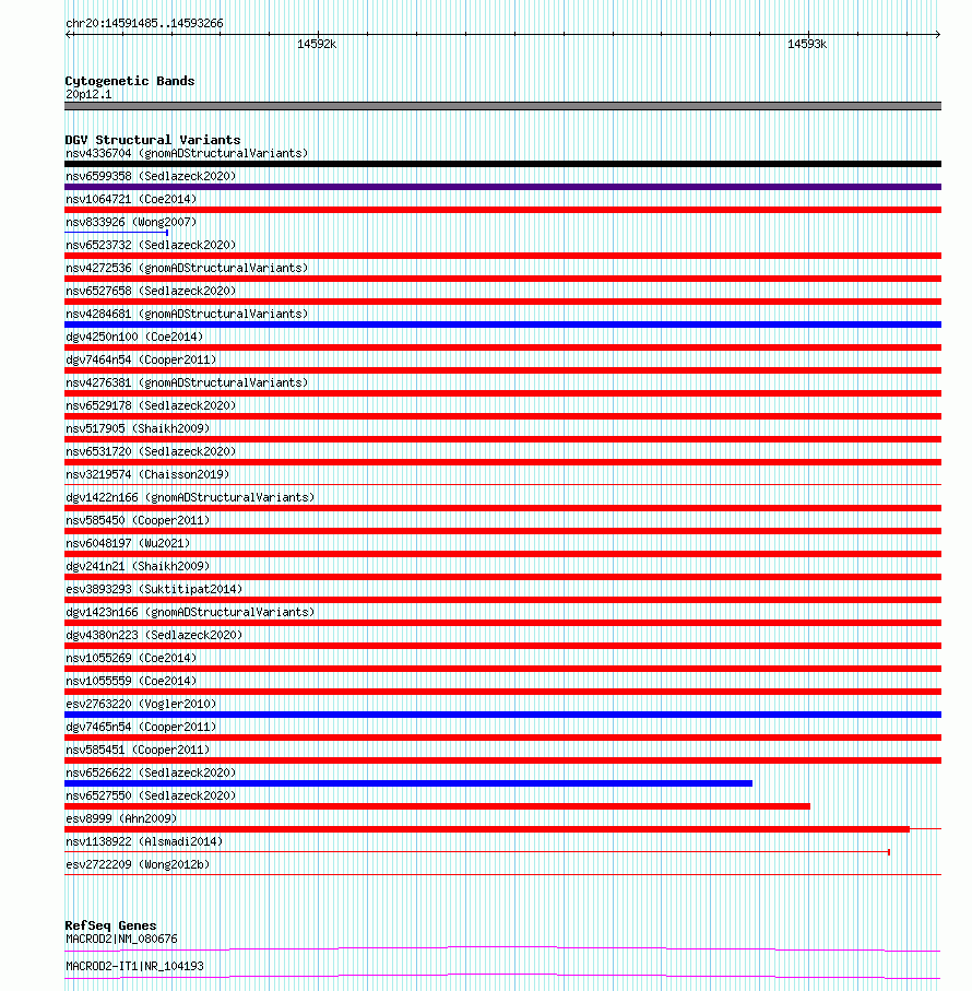 | | Variant Type | CNV deletion | | Copy Number | | | Allele State | | | Allele Origin | | | Probe Count | | | Validation Flag | | | Merged Status | S | | Merged Variants | esv2722209 | | Supporting Variants | | | Samples | SSM029 | | Known Genes | MACROD2, MACROD2-IT1 | | Method | Sequencing | | Analysis | Breakdancer:4 times standard deviation,VariationHunter:4 times standard deviation and at least 3 supportting reads | | Platform | Illumina HiSeq 2000 | | Comments | | | Reference | Wong_et_al_2012b | | Pubmed ID | 23290073 | | Accession Number(s) | essv6666211