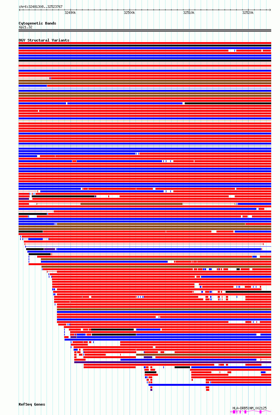 Variant DetailsVariant: essv6667526| Internal ID | 10084582 | | Landmark | | | Location Information | | | Cytoband | 6p21.32 | | Allele length | | Assembly | Allele length | | hg38 | 42460 | | hg19 | 42460 |
