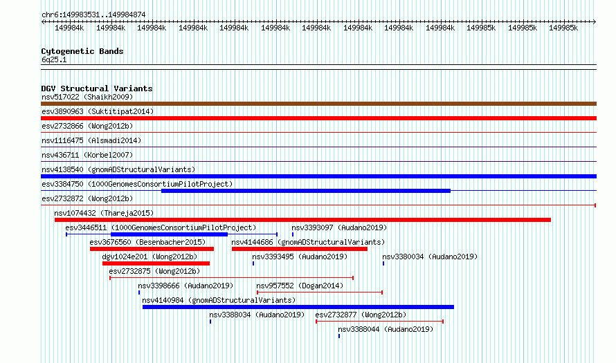 Variant DetailsVariant: essv6667629| Internal ID | 9737989 | | Landmark | | | Location Information | | | Cytoband | 6q25.1 | | Allele length | | Assembly | Allele length | | hg38 | 1344 | | hg19 | 1344 |