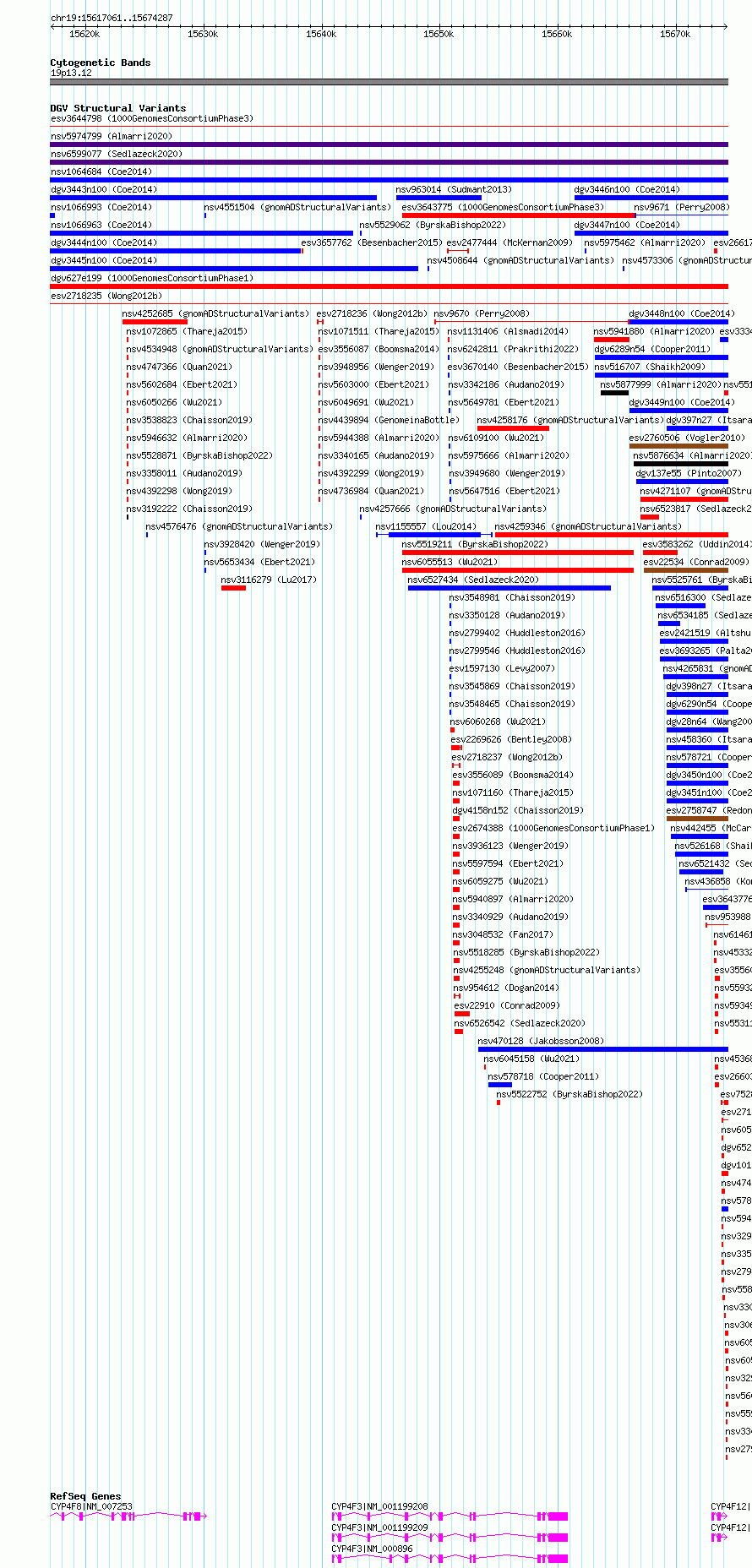 Variant DetailsVariant: essv6668715| Internal ID | 10083996 | | Landmark | | | Location Information | | | Cytoband | 19p13.12 | | Allele length | | Assembly | Allele length | | hg38 | 57227 | | hg19 | 57226 |