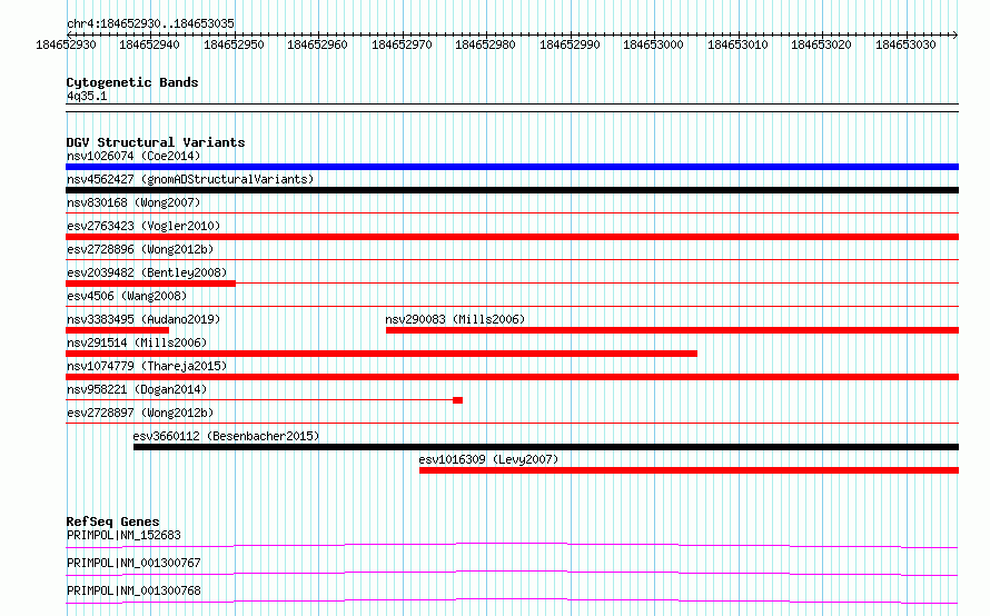 | | Variant Type | CNV deletion | | Copy Number | | | Allele State | | | Allele Origin | | | Probe Count | | | Validation Flag | | | Merged Status | S | | Merged Variants | esv2728896, esv2728897 | | Supporting Variants | | | Samples | SSM031 | | Known Genes | PRIMPOL | | Method | Sequencing | | Analysis | Breakdancer:4 times standard deviation,VariationHunter:4 times standard deviation and at least 3 supportting reads | | Platform | Illumina HiSeq 2000 | | Comments | | | Reference | Wong_et_al_2012b | | Pubmed ID | 23290073 | | Accession Number(s) | essv6670563