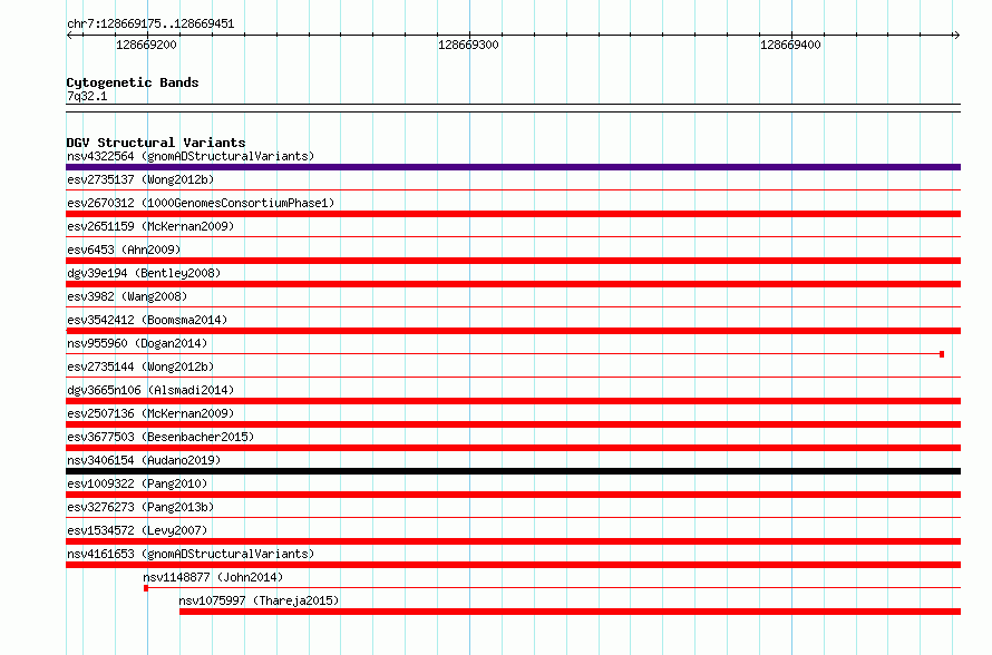 Variant DetailsVariant: essv6671653| Internal ID | 9739323 | | Landmark | | | Location Information | | | Cytoband | 7q32.1 | | Allele length | | Assembly | Allele length | | hg38 | 277 | | hg19 | 277 |
