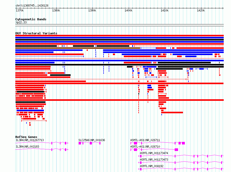 | | Variant Type | CNV deletion | | Copy Number | | | Allele State | | | Allele Origin | | | Probe Count | | | Validation Flag | | | Merged Status | S | | Merged Variants | esv2739692, esv2739688, esv2739690, esv2739686 | | Supporting Variants | | | Samples | SSM031 | | Known Genes | ASMTL, ASMTL-AS1, IL3RA, SLC25A6 | | Method | Sequencing | | Analysis | Breakdancer:4 times standard deviation,VariationHunter:4 times standard deviation and at least 3 supportting reads | | Platform | Illumina HiSeq 2000 | | Comments | | | Reference | Wong_et_al_2012b | | Pubmed ID | 23290073 | | Accession Number(s) | essv6671817