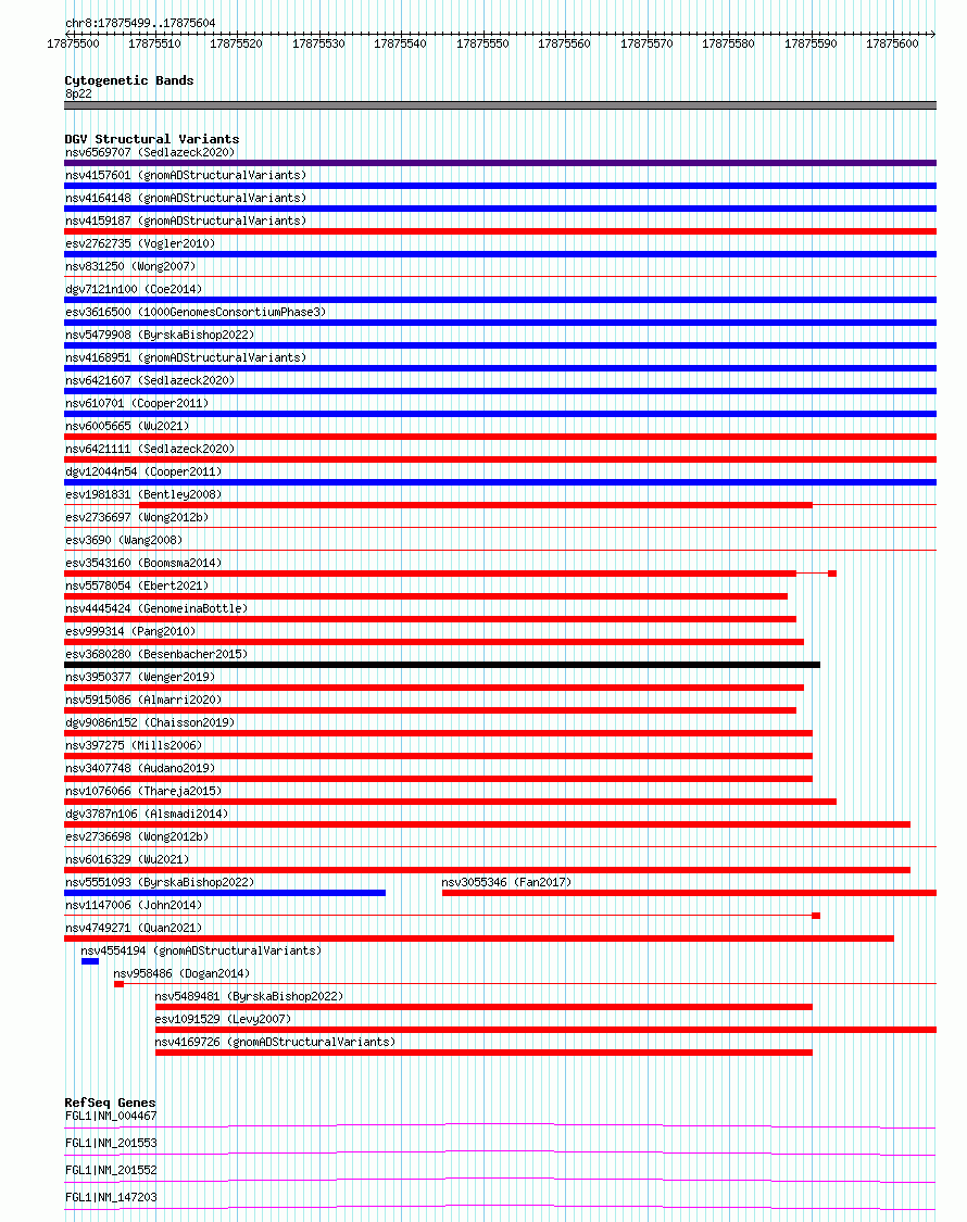 Variant DetailsVariant: essv6672046| Internal ID | 10085657 | | Landmark | | | Location Information | | | Cytoband | 8p22 | | Allele length | | Assembly | Allele length | | hg38 | 106 | | hg19 | 106 |