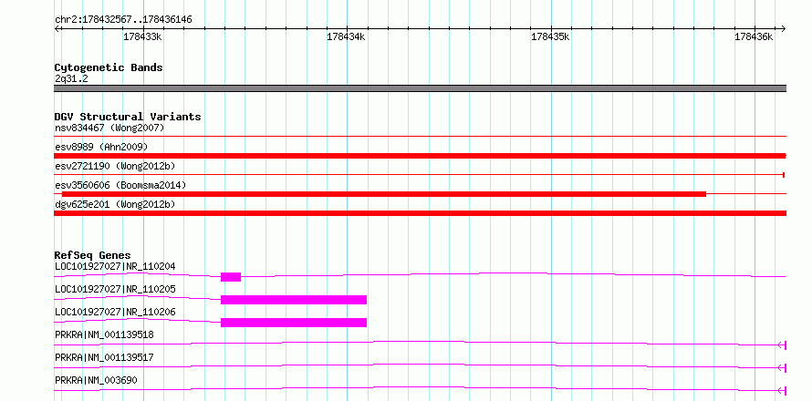 | Variant Type | CNV deletion | Copy Number | | Allele State | | Allele Origin | | Probe Count | | Validation Flag | | Merged Status | S | Merged Variants | esv2721190 | Supporting Variants | | Samples | SSM005 | Known Genes | MIR548N, PRKRA | Method | Sequencing | Analysis | Breakdancer:4 times standard deviation,VariationHunter:4 times standard deviation and at least 3 supportting reads | Platform | Illumina HiSeq 2000 | Comments | | Reference | Wong_et_al_2012b | Pubmed ID | 23290073 | Accession Number(s) | essv6672354