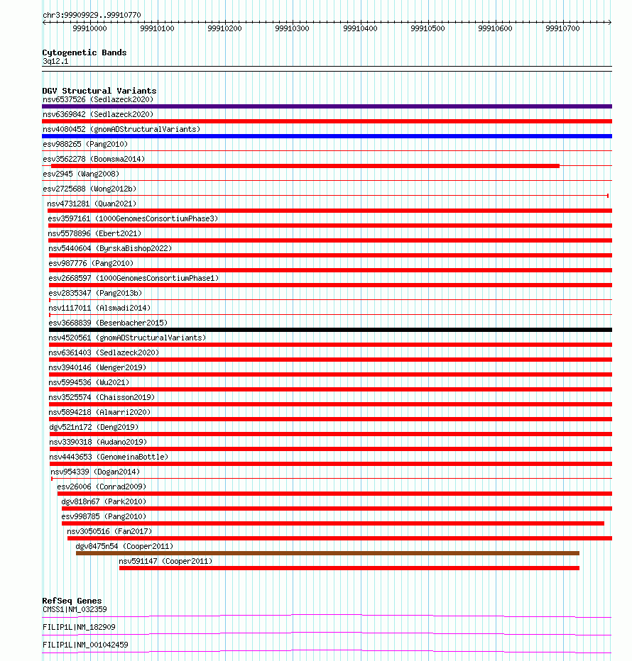 Variant DetailsVariant: essv6673399| Internal ID | 9992843 | | Landmark | | | Location Information | | | Cytoband | 3q12.1 | | Allele length | | Assembly | Allele length | | hg38 | 842 | | hg19 | 842 |