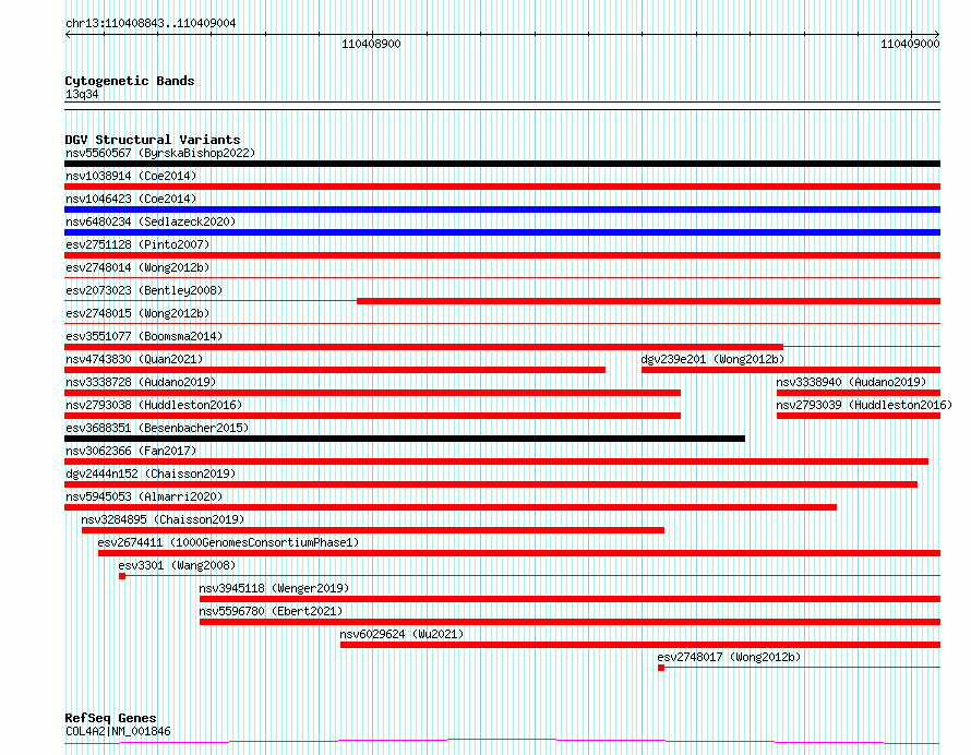 | | Variant Type | CNV deletion | | Copy Number | | | Allele State | | | Allele Origin | | | Probe Count | | | Validation Flag | | | Merged Status | S | | Merged Variants | esv2748015, esv2748014 | | Supporting Variants | | | Samples | SSM031 | | Known Genes | COL4A2 | | Method | Sequencing | | Analysis | Breakdancer:4 times standard deviation,VariationHunter:4 times standard deviation and at least 3 supportting reads | | Platform | Illumina HiSeq 2000 | | Comments | | | Reference | Wong_et_al_2012b | | Pubmed ID | 23290073 | | Accession Number(s) | essv6673505