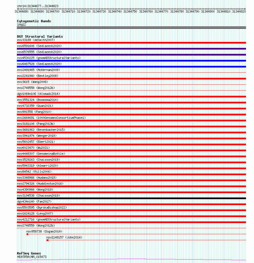 Variant DetailsVariant: essv6673597| Internal ID | 10089921 | | Landmark | | | Location Information | | | Cytoband | 14q12 | | Allele length | | Assembly | Allele length | | hg38 | 147 | | hg19 | 147 |