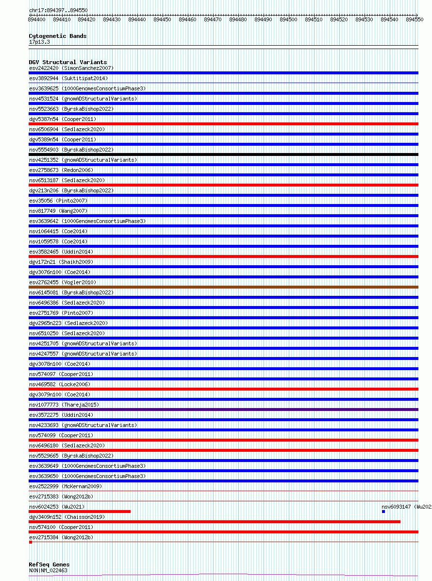 Variant DetailsVariant: essv6674198| Internal ID | 10089382 | | Landmark | | | Location Information | | | Cytoband | 17p13.3 | | Allele length | | Assembly | Allele length | | hg38 | 154 | | hg19 | 154 |