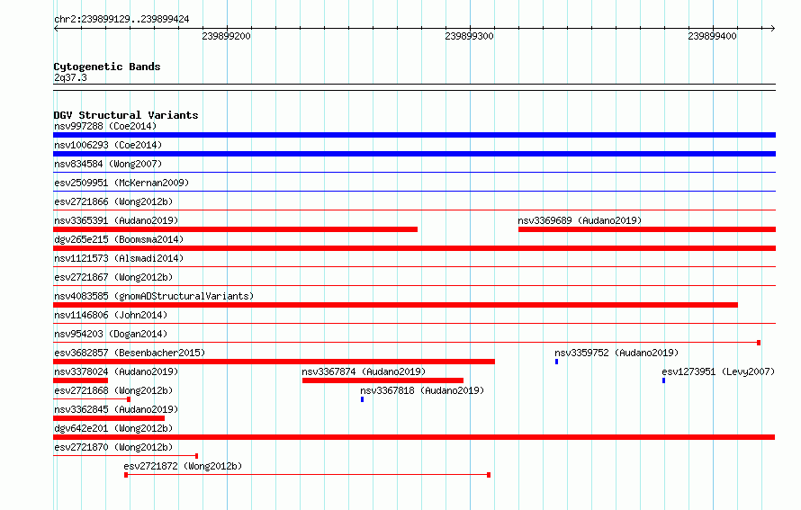 Variant DetailsVariant: essv6675683| Internal ID | 9746095 | | Landmark | | | Location Information | | | Cytoband | 2q37.3 | | Allele length | | Assembly | Allele length | | hg38 | 296 | | hg19 | 296 |