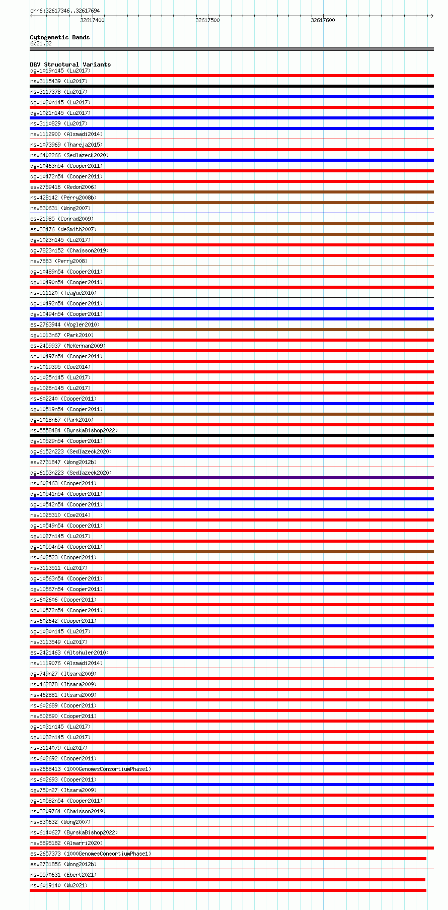Variant DetailsVariant: essv6676556| Internal ID | 10093930 | | Landmark | | | Location Information | | | Cytoband | 6p21.32 | | Allele length | | Assembly | Allele length | | hg38 | 349 | | hg19 | 349 |