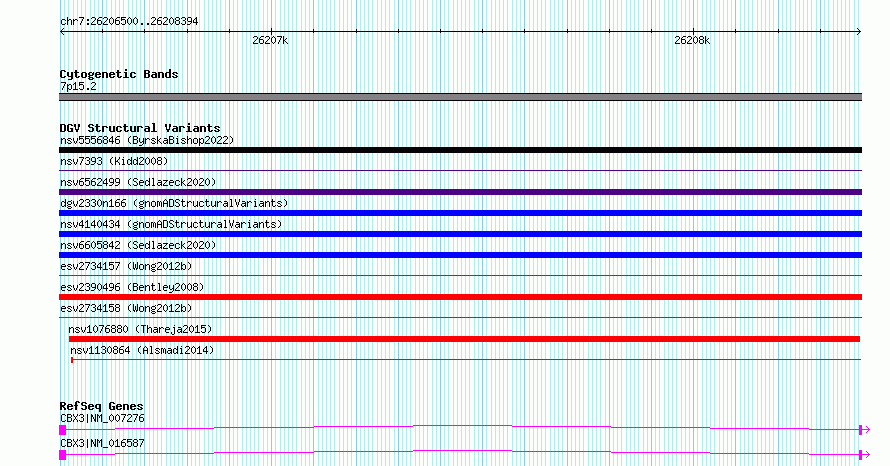 | | Variant Type | CNV deletion | | Copy Number | | | Allele State | | | Allele Origin | | | Probe Count | | | Validation Flag | | | Merged Status | S | | Merged Variants | esv2734157, esv2734158 | | Supporting Variants | | | Samples | SSM032 | | Known Genes | CBX3 | | Method | Sequencing | | Analysis | Breakdancer:4 times standard deviation,VariationHunter:4 times standard deviation and at least 3 supportting reads | | Platform | Illumina HiSeq 2000 | | Comments | | | Reference | Wong_et_al_2012b | | Pubmed ID | 23290073 | | Accession Number(s) | essv6676794