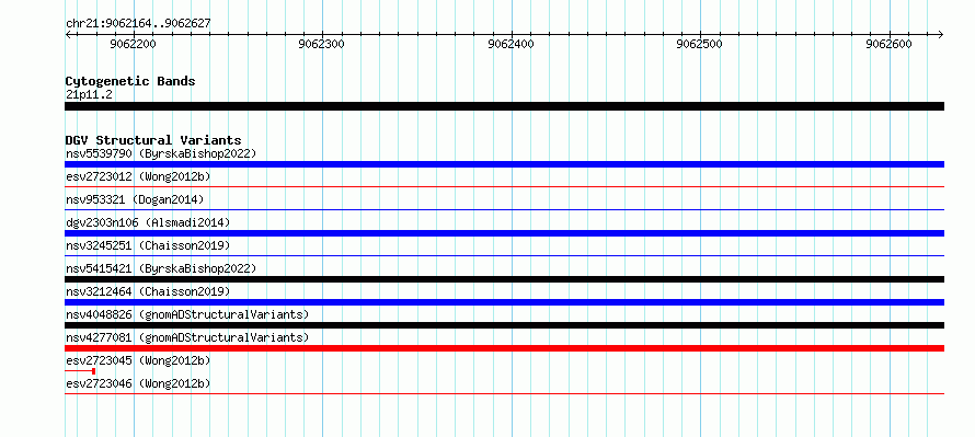 Variant DetailsVariant: essv6679011| Internal ID | 10092336 | | Landmark | | | Location Information | | | Cytoband | 21p11.2 | | Allele length | | Assembly | Allele length | | hg38 | 464 | | hg19 | 464 |