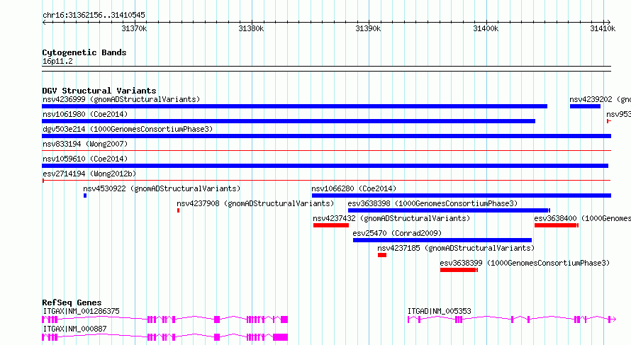 | Variant Type | CNV deletion | Copy Number | | Allele State | | Allele Origin | | Probe Count | | Validation Flag | | Merged Status | S | Merged Variants | esv2714194 | Supporting Variants | | Samples | SSM033 | Known Genes | ITGAD, ITGAX | Method | Sequencing | Analysis | Breakdancer:4 times standard deviation,VariationHunter:4 times standard deviation and at least 3 supportting reads | Platform | Illumina HiSeq 2000 | Comments | | Reference | Wong_et_al_2012b | Pubmed ID | 23290073 | Accession Number(s) | essv6682022