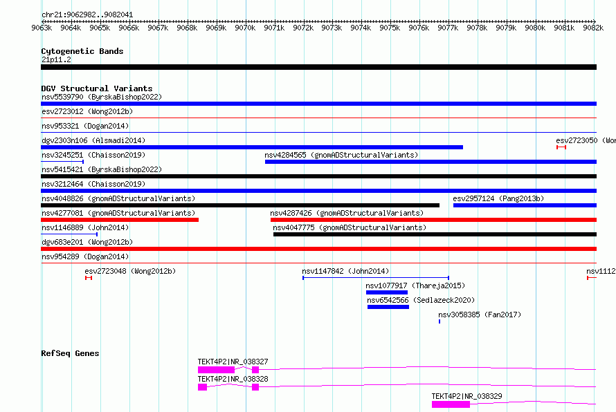 Variant DetailsVariant: essv6682722| Internal ID | 10095428 | | Landmark | | | Location Information | | | Cytoband | 21p11.2 | | Allele length | | Assembly | Allele length | | hg38 | 19060 | | hg19 | 19060 |