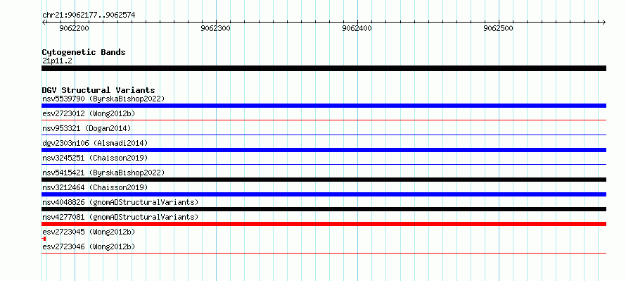 Variant DetailsVariant: essv6682723| Internal ID | 10095429 | | Landmark | | | Location Information | | | Cytoband | 21p11.2 | | Allele length | | Assembly | Allele length | | hg38 | 398 | | hg19 | 398 |
