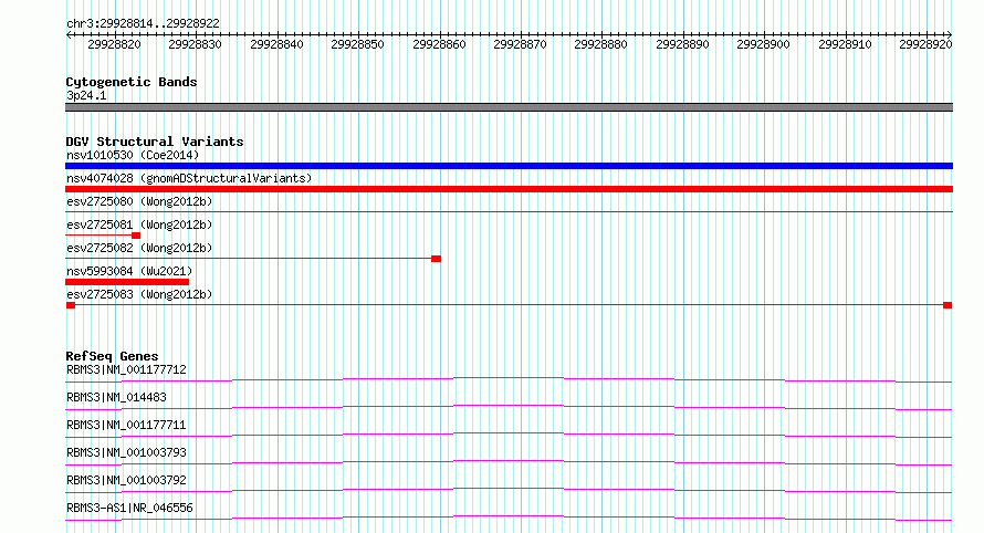 | | Variant Type | CNV deletion | | Copy Number | | | Allele State | | | Allele Origin | | | Probe Count | | | Validation Flag | | | Merged Status | S | | Merged Variants | esv2725080, esv2725083 | | Supporting Variants | | | Samples | SSM034 | | Known Genes | RBMS3 | | Method | Sequencing | | Analysis | Breakdancer:4 times standard deviation,VariationHunter:4 times standard deviation and at least 3 supportting reads | | Platform | Illumina HiSeq 2000 | | Comments | | | Reference | Wong_et_al_2012b | | Pubmed ID | 23290073 | | Accession Number(s) | essv6683280