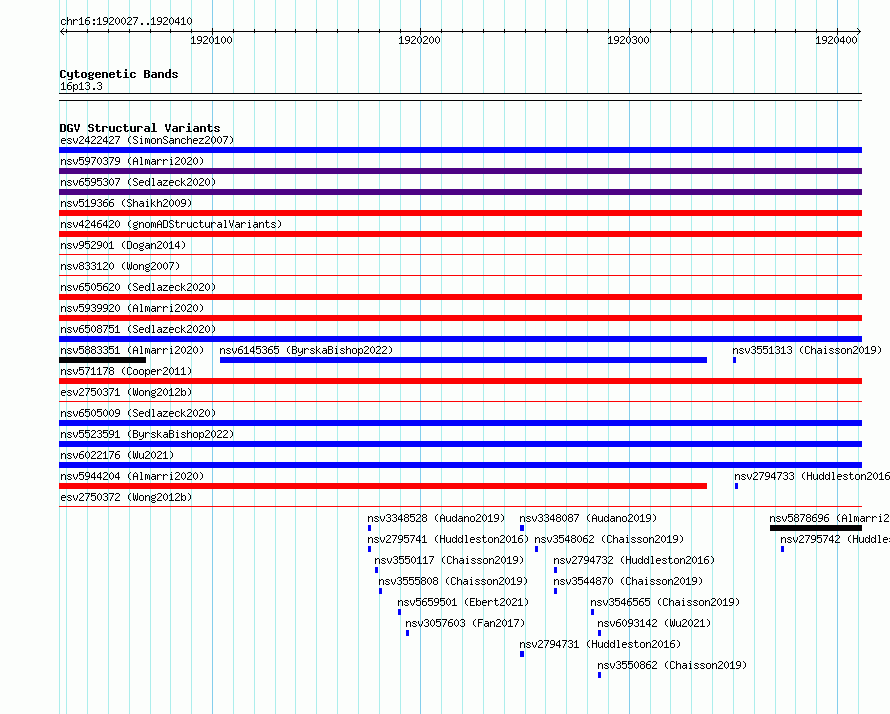 Variant DetailsVariant: essv6685486| Internal ID | 10100595 | | Landmark | | | Location Information | | | Cytoband | 16p13.3 | | Allele length | | Assembly | Allele length | | hg38 | 384 | | hg19 | 384 |