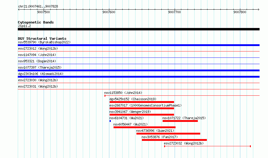 Variant DetailsVariant: essv6686052| Internal ID | 10098205 | | Landmark | | | Location Information | | | Cytoband | 21p11.2 | | Allele length | | Assembly | Allele length | | hg38 | 368 | | hg19 | 368 |