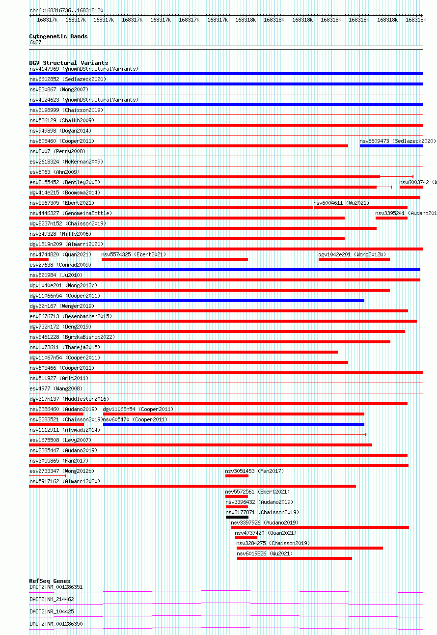 | | Variant Type | CNV deletion | | Copy Number | | | Allele State | | | Allele Origin | | | Probe Count | | | Validation Flag | | | Merged Status | S | | Merged Variants | esv2733348, esv2733346, esv2733342, esv2733344 | | Supporting Variants | | | Samples | SSM035 | | Known Genes | DACT2 | | Method | Sequencing | | Analysis | Breakdancer:4 times standard deviation,VariationHunter:4 times standard deviation and at least 3 supportting reads | | Platform | Illumina HiSeq 2000 | | Comments | | | Reference | Wong_et_al_2012b | | Pubmed ID | 23290073 | | Accession Number(s) | essv6687384