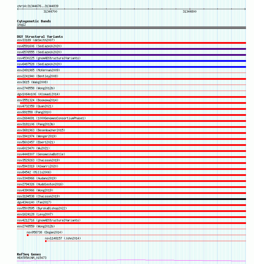 Variant DetailsVariant: essv6688485| Internal ID | 10102350 | | Landmark | | | Location Information | | | Cytoband | 14q12 | | Allele length | | Assembly | Allele length | | hg38 | 164 | | hg19 | 164 |