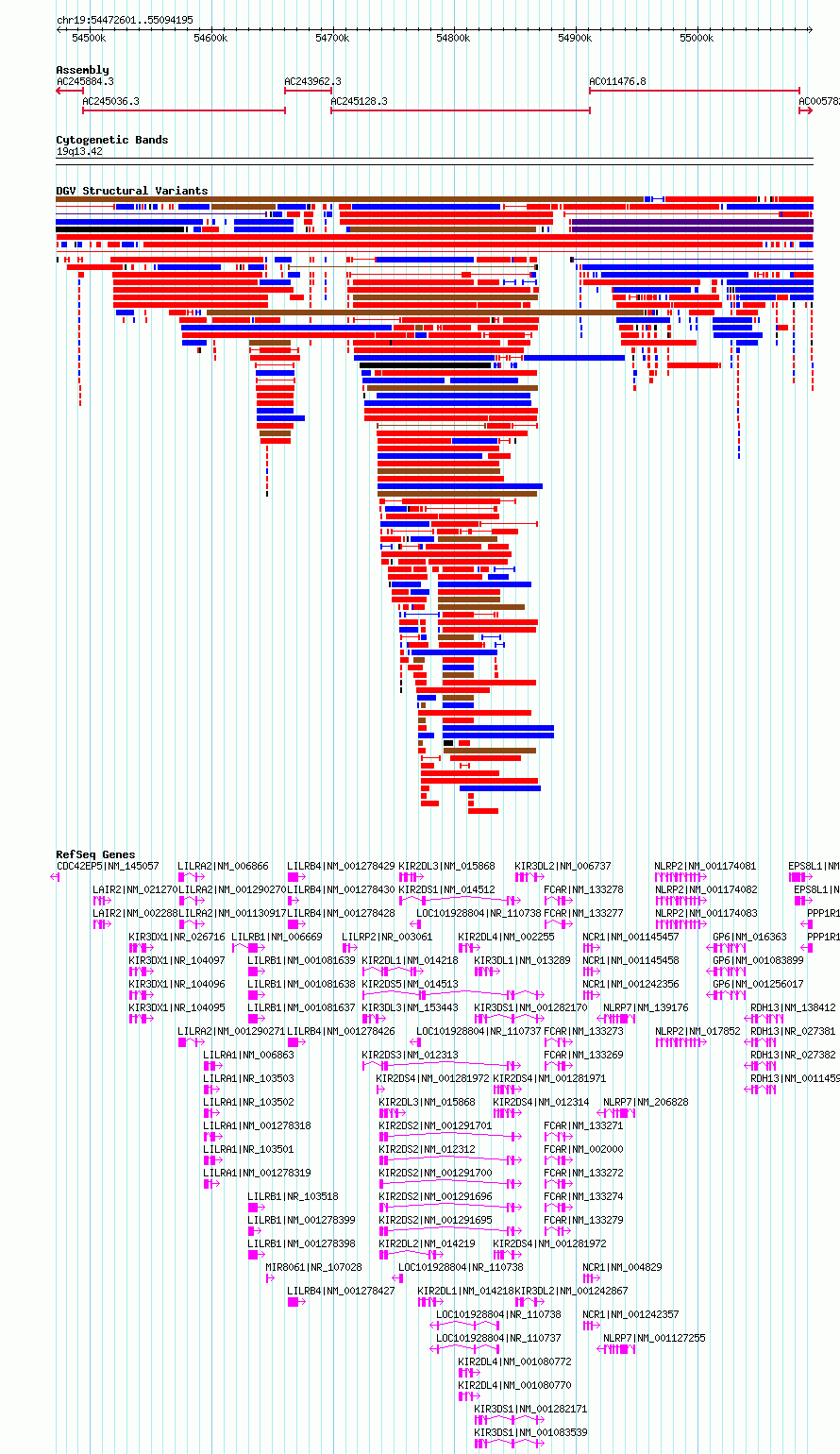 | | Variant Type | CNV deletion | | Copy Number | | | Allele State | | | Allele Origin | | | Probe Count | | | Validation Flag | | | Merged Status | S | | Merged Variants | esv2718872 | | Supporting Variants | | | Samples | SSM035 | | Known Genes | CDC42EP5, EPS8L1, FCAR, GP6, KIR2DL1, KIR2DL3, KIR2DL4, KIR2DS4, KIR3DL1, KIR3DL2, KIR3DL3, KIR3DX1, LAIR2, LILRA1, LILRA2, LILRB1, LILRB4, LILRP2, LOC100287534, MIR8061, NCR1, NLRP2, NLRP7, PPP1R12C, RDH13, RNU6-35P, RNU6-64P | | Method | Sequencing | | Analysis | Breakdancer:4 times standard deviation,VariationHunter:4 times standard deviation and at least 3 supportting reads | | Platform | Illumina HiSeq 2000 | | Comments | | | Reference | Wong_et_al_2012b | | Pubmed ID | 23290073 | | Accession Number(s) | essv6689097