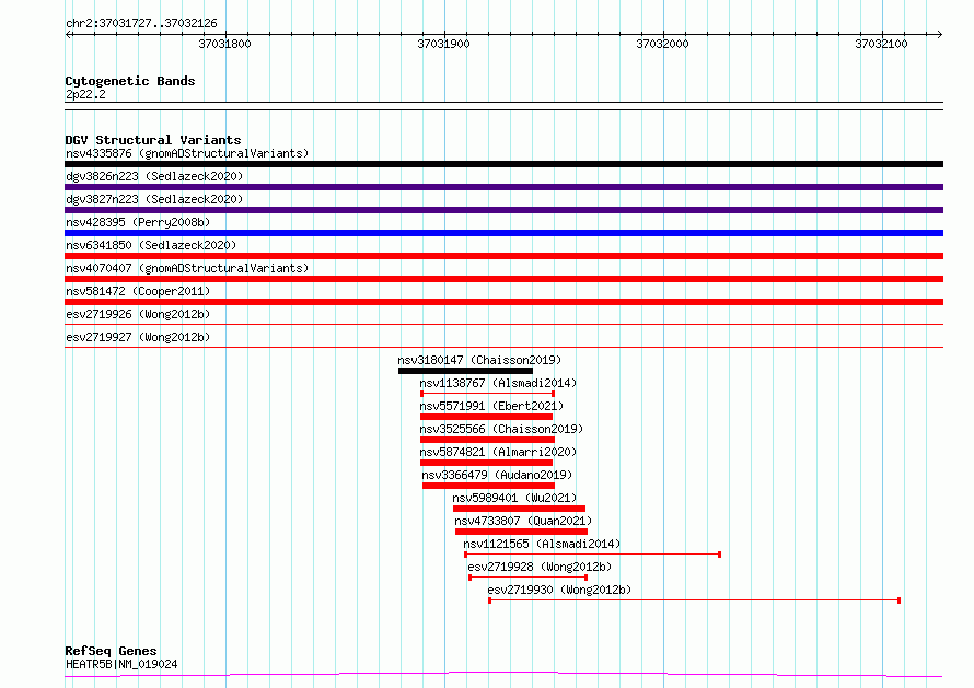 Variant DetailsVariant: essv6689538| Internal ID | 10106807 | | Landmark | | | Location Information | | | Cytoband | 2p22.2 | | Allele length | | Assembly | Allele length | | hg38 | 400 | | hg19 | 400 |