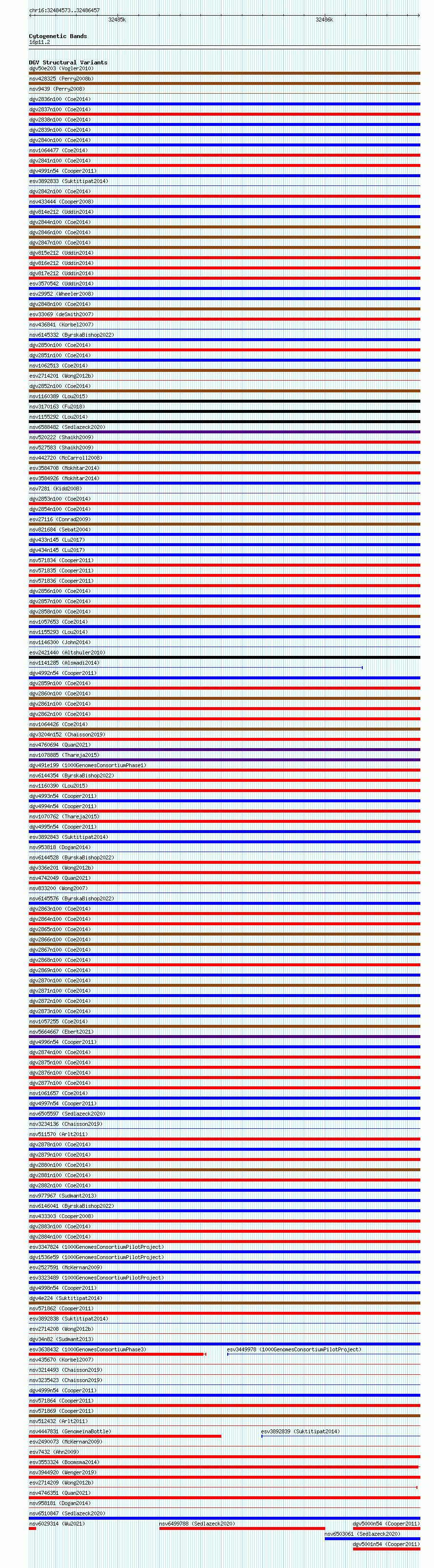 Variant DetailsVariant: essv6690576| Internal ID | 9993213 | | Landmark | | | Location Information | | | Cytoband | 16p11.2 | | Allele length | | Assembly | Allele length | | hg38 | 1885 | | hg19 | 1885 |