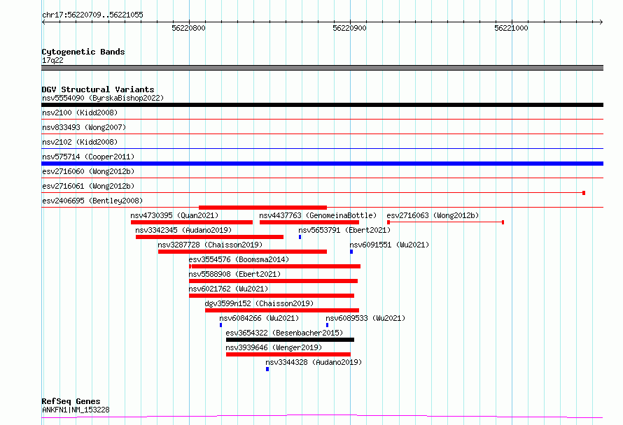 Variant DetailsVariant: essv6691865| Internal ID | 9992720 | | Landmark | | | Location Information | | | Cytoband | 17q22 | | Allele length | | Assembly | Allele length | | hg38 | 347 | | hg19 | 347 |