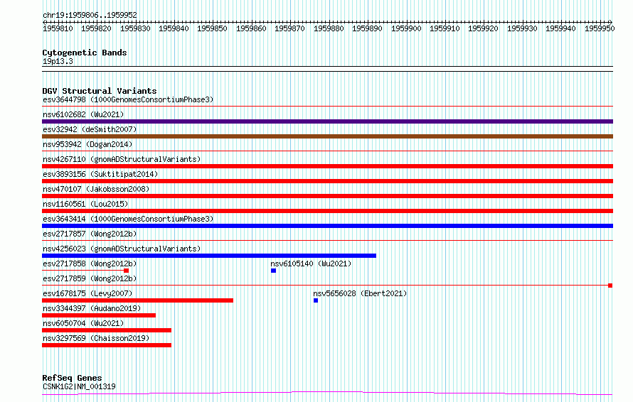 Variant DetailsVariant: essv6692403| Internal ID | 10105703 | | Landmark | | | Location Information | | | Cytoband | 19p13.3 | | Allele length | | Assembly | Allele length | | hg38 | 147 | | hg19 | 147 |