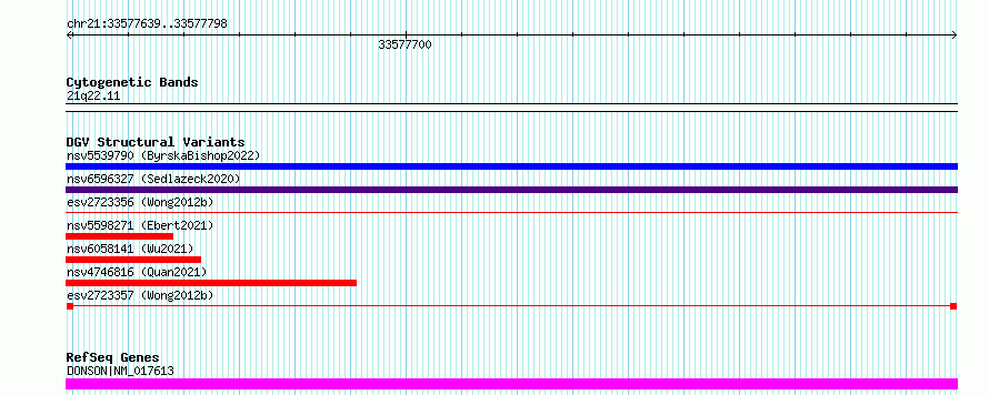 | | Variant Type | CNV deletion | | Copy Number | | | Allele State | | | Allele Origin | | | Probe Count | | | Validation Flag | | | Merged Status | S | | Merged Variants | esv2723356, esv2723357 | | Supporting Variants | | | Samples | SSM036 | | Known Genes | DONSON | | Method | Sequencing | | Analysis | Breakdancer:4 times standard deviation,VariationHunter:4 times standard deviation and at least 3 supportting reads | | Platform | Illumina HiSeq 2000 | | Comments | | | Reference | Wong_et_al_2012b | | Pubmed ID | 23290073 | | Accession Number(s) | essv6692658